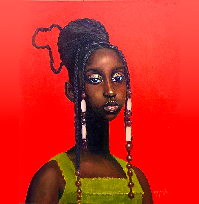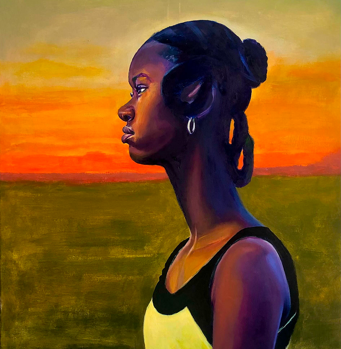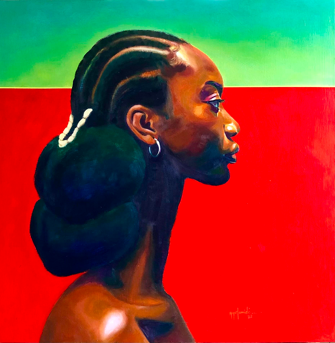 Through the figure's gaze, the artist explored the tension between cultural identity and adaptation. The use of traditional African hairstyling is a symbolistic representation of the artist’s roots, while the surrounding contrasts in fashion and palette, reflecting the differences encountered (from hairstyles to weather-driven fashion, food, and social dynamics.)