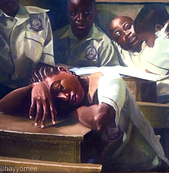 In the painting "Awaiting the Bell," there is a depiction of a classroom filled with students wearing uniforms, eagerly waiting for the bell to ring. However, the main character stands out as she is depicted sleeping, possibly out of exhaustion. It's a scene that captures the contrast between the students' anticipation and the main character's need for rest.
