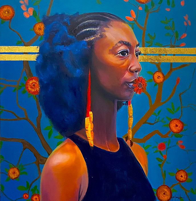 The Beauty in the Gold Lining explores individuality and self-expression through culture and fashion. With vibrant colors and symbolism, it highlights the creativity of Black women—the blue kinky hair, orange flowers, and gold stripes reflecting uniqueness, heritage, and confidence. The work challenges beauty standards while celebrating diverse identities and authenticity.