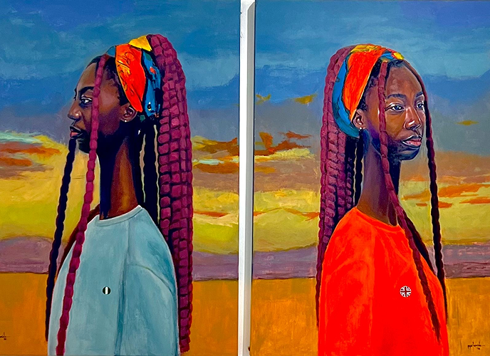 Above the Hills is a diptych piece narrating the artist’s migration journey. One figure looks to the left, symbolizing her past, while the other looks to the right, reflecting her new life.